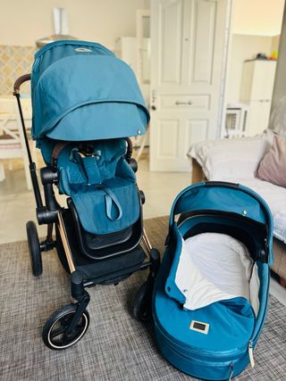 Carrito de bebé Cybex Priam color blue mountain. Interiores y acabado de satén. Combinación de colores elegante y único. El lote incluye: - capazo completo ( incluye la tapa de cierre que no sale en la foto) - sillita de paseo con barra. - silla de coche porta bebé último modelo combinable con la estructura. - estructura rose gold. - burbuja para la lluvia para la sillita. - soportes para montar el capazo y maxicosi en la estructura. Estado muy bueno. La estructura tiene arañazos en la zona de las ruedas por el uso. Se vende desde 540€ sin silla de coche de bebé. 160€ silla de coche de bebé con cojin reductor. Valorado en tien