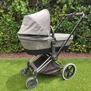 Se vende chasis y capazo de carrito Cybex Priam. Usado pero listo para otro bebé. Muy amplio con ruedas grandes para pasear. - Chasis de color cromado - Capazo con capota gris jaspeado. - Asa del manillar tiene protectores porque está desgastado El capazo es el modelo antiguo y sirve como mini cuna ocasional hasta los 6 meses. Regalo protector solar, funda de lluvia y guantes de invierno. Chasis compatible con maxicosi, lleva adaptadores. Se puede comprar la silla Priam para colocar en el chasis.
