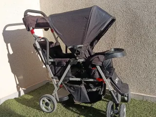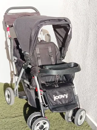 Carro gemelar Joovy Caboose Ultralight en color negro. Diseñado para dos niños, con asiento delantero y plataforma trasera. - Estructura ligera y resistente. - Capota para el sol. - Bandeja portaobjetos. - Ruedas para facilitar el movimiento. - Plástico de protección lluvia - Ideal para hermanos de diferentes edades, se le puede acoplar un maxicosi universal para bebé. - Se reclinan ambos asientos y puedes llevar a un niño de pié. - Fácil plegado ocupando mínimo espacio