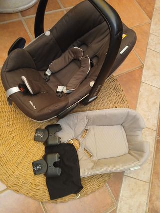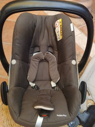Cuna para bebé Maxi-Cosi Pebble Plus de color marrón en buen estado. Incluye reductor para recién nacido y dos bases para el coche. Ideal para recién nacidos y bebés pequeños.