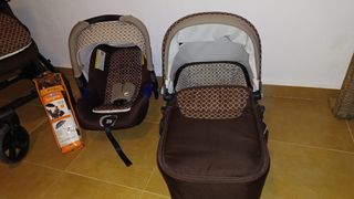 Carro de bebe que incluye silla de paseo y maxi-coxi grupo 0 para el asiento del coche. Incluye tambien bolsa, plastico para lluvia y recambios en color mostaza de la capota y funda protectora. Esta en buenas condiciones y se pliega/despliega perfectamente
