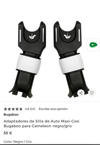 Adaptador Bugaboo para silla de coche Maxi-Cosi. Se acopla fácilmente al cochecito Bugaboo Cameleon. Sistema 'click & go' para una conexión rápida y sencilla. Incluye 2 adaptadores. Están en buen estado.