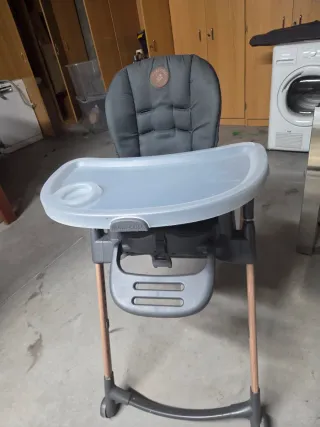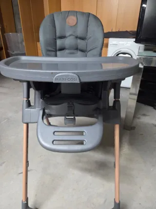 Trona Maxi-Cosi en color Graphite. Diseño moderno y funcional. - Bandeja extraíble. - Asiento acolchado. - Reposapiés ajustable. - Patas de madera. Poco uso (2 niños) y bien conservado