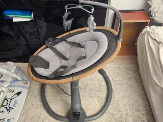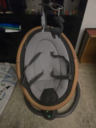 Hamaca eléctrica Maxi-Cosi con un diseño moderno y elegante. - Funciona enchufada a la corriente o con pilas, si necesitas llevartela fuera de casa. - La tela esta nueva, en perfecto estado. - A penas usada un mes. - Estructura principal en color gris oscuro. - Asiento acolchado en tela gris. - Aro exterior en acabado madera. - Móvil con figuras de animales y cactus. - Se puede ver sin compromiso.