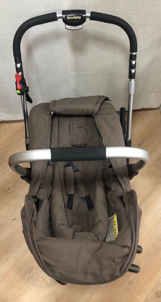 Carrito bebé de color negro y gris. Colores unisex, lo mismo para niño que para niña. Con todos sus complementos: Bolsa con cambiador, plástico de la lluvia y su maxicosi para recién nacido. Uso solo de una niña. Muy bien conservado. Marca : Casualplay vintage 2.