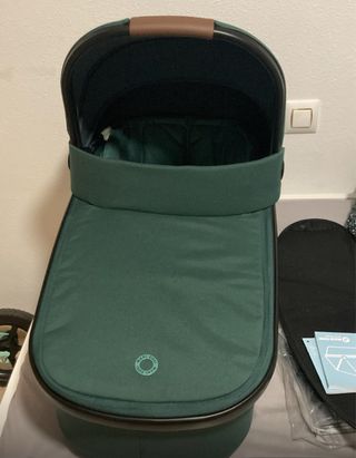 Capazo Maxi-Cosi Oria en color verde oscuro. Perfecto para los primeros meses del bebé. sin estructura - Asa de transporte. - Capota. - Interior acolchado. - Burbuja para lluvia -Sábanas y protector de regalo