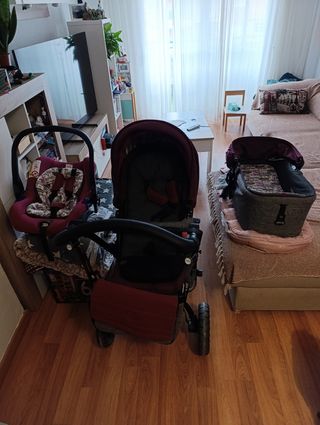 Carro capazo con cuco o moises , silla paseo, maxicosi para el coche grupo 0.. muy buen estado Incluye mochila original para carro , protector para lluvia, sombrilla ,cubrecapazo y saco forro polar para invierno.Pegatina para coche Cerrado ocupa poco espacio. Manejable y buena calidad Ruedas robustas. Comprado en Toys r us. El valor es el doble Por medidas el envío sólo puede hacerse con Correos