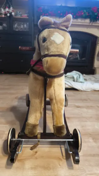 Caballito mecedora de peluche-madera con un diseño clásico y divertido. - Peluche suave de color beige. - Riendas y silla de montar en marrón. - Base mecedora de madera oscura. - Ruedas para facilitar el movimiento, si se suben sirve de mecedora.