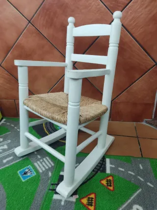 Mecedora infantil de madera pintada en blanco con asiento de esparto. - Estructura de madera. - Asiento de esparto tejido. - Diseño clásico de mecedora. Está en muy buen estado, perfecta para la habitación de los peques de la casa.