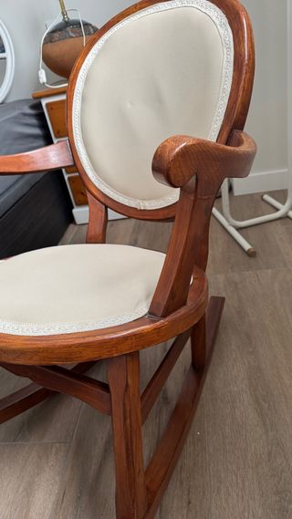 Butaca mecedora cómoda, ideal para momentos de descanso o lactancia. - Tapizado en tela tipo chenilla color crudo. - Diseño clásico con brazos redondeados y respaldo plano. - Patas de madera. Medidas 80x80x100. Recogida, no se envía.