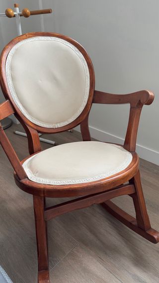 Mecedora infantil de madera con un diseño clásico y robusto. Usada muy poco como atrezzo de fotografía. Se puede separar la silla de la base. - Fabricada en madera. - Asiento y respaldo. - Brazos laterales. - Base mecedora para balanceo.