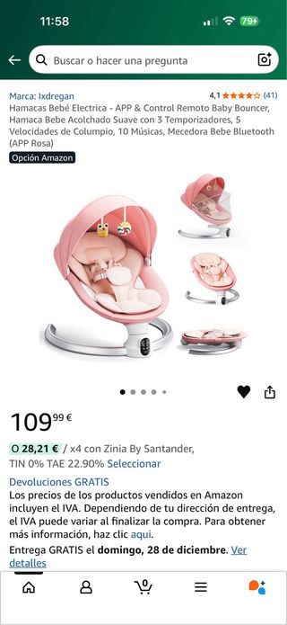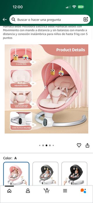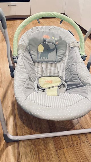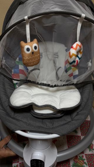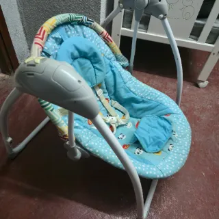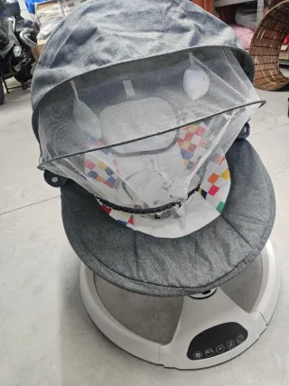 Hamaca mecedora eléctrica para bebés, ideal para el descanso y entretenimiento. - Diseño moderno y seguro. - Incluye mosquitera y cable para conectar a la luz. - Base estable y resistente. - Con mando y bluetooth para poner música. - Complementos en perfecto estado. - Sin apenas uso, la compre de segunda mano en agosto, con poco uso, ha estado guardada hasta finales de diciembre y llevo un mes intentando q mi hija se distraiga en ella y demas pero no es posible, no le gusta, asi q no tiene apenas uso.