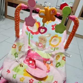 Silla mecedora de bebé con un diseño alegre y colorido, ideal para los más pequeños. - Estructura principal en color rosa. - Acolchado con estampado de flores, conejos y abejas. - Barra de juguetes superior con mariposa y flores. - Incluye arnés de seguridad.