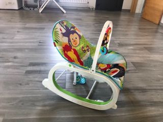 Mecedora para bebés de la marca Fisher Price con un divertido diseño. A recoger en Valencia. - Tejido acolchado con estampado de animales. - Estructura de plástico resistente en color verde. - Asiento reclinable en varias posiciones. - Plegable