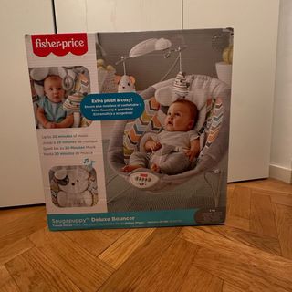 Mecedora para bebé de la marca Fisher-Price, modelo Snugapuppy Deluxe Bouncer. Es extra suave y cómoda. - Hasta 20 minutos de música. - Diseño con temática de perro. - Incluye juguetes colgantes.