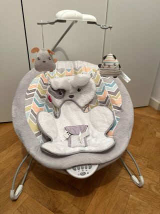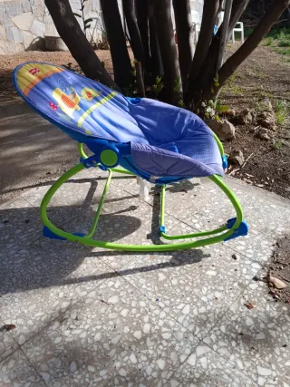 Mecedora para bebés con un diseño alegre y colorido. Esta bien y mece sola con pilas. Esta bien solo le hace falta limpiarla. Se recoge en domicilio. - Estampado con animales y rayas. - Colores vibrantes: naranja, verde y azul. - Incluye arnés de seguridad.