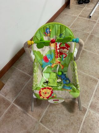 Mecedora para bebé de 0 a 18 meses con diseño de animales de la selva. Es cómoda y segura, tiene modo vibración para simular el paseo con un carrito. - Estructura de metal y tela. - Barra de juguetes con peluches. - Arnés de seguridad. - Marca Fisher-Price. - Desmontable y lavable sus conjuntos de tela Se encuentra MARBELLA. se entrega en mano. No dispongo de la caja original.