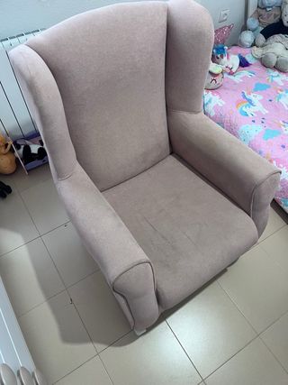 Para recoger en Bilbao. Sillón o butaca tapizado en color rosa, con respaldo alto Patas de mecedora en color madera. Ideal para lactancia. Sin usar