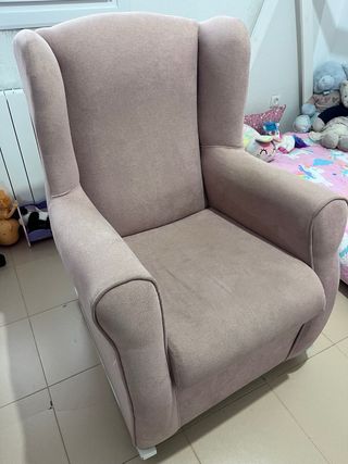 Acogedor sillón de lactancia con función mecedora, tapizado en un suave color rosa. - Diseño clásico con alas. - Base mecedora blanca. Necesita una limpieza Esponjas en muy buen estado Ancho 72 x alto 93 x 60 fondo Se regala la funda elastica color gris