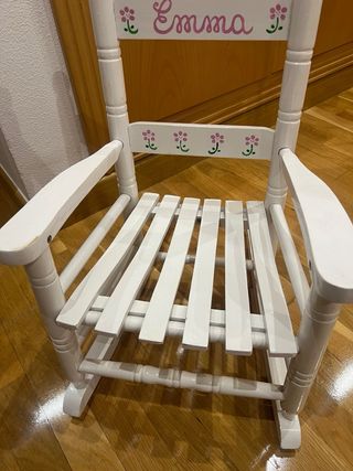 Mecedora infantil de madera en color blanco. Perfecta para la habitación de los más pequeños. Usada en sesiones de fotografía. Mesidas 58 alto, 36 largo y 68 fondo. La envio desmontada. - Diseño clásico y seguro. - Ideal para relajar y entretener.