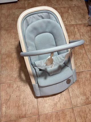 Mecedora automática de la marca Maxi-Cosi, ideal para relajar al bebé. Cuenta con un diseño moderno y funcional. Tiene 6 velocidades. Usado dos veces. Costo 160 euros - Función de balanceo automático. - Reproduce música. - Estructura de madera y base gris. - Arnés de seguridad de 5 puntos.