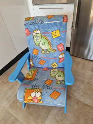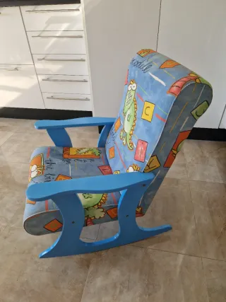 Mecedora infantil con estructura de madera y asiento de tela. - Diseño moderno y cómodo. - La estructura está perfecta, el tapizado tiene un pequeño picotazo (se podría volver a tapizar) - Ideal para habitaciones infantiles.