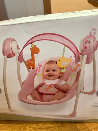 Mecedora portátil Ingenuity Comfort 2 Go, ideal para calmar y entretener al bebé. Cuenta con un diseño plegable para facilitar su transporte y almacenamiento. - Barra de juguetes desmontable con 2 peluches. - Plegado rápido y asa de transporte. - Tecnología WhisperQuiet para un balanceo silencioso. - 12 melodías preprogramadas. - Asiento acolchado para mayor comodidad. - Como se ve en las imagenes la caja esta un poco dañada del paso del tiempo en el trastero pero la mecedora esta nueva no la llegamos a usar mas que dos 3 o 4 veces.