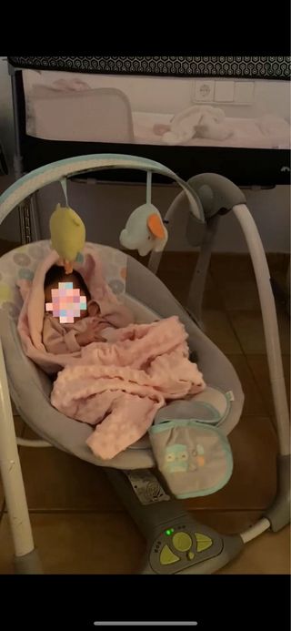 Hamaca mecedora para bebé, en perfecto estado, muy poco uso. Ideal para que el bebé se relaje y se quede dormido gracias al movimiento. - Hamaca desmontable. Puede soltarse del columpio y usarse sola. Dispone también de un vibrador. -Columpio mecedora automático con 6 velocidades, sonidos de la naturaleza, ruido blanco, luces y estrellitas, temporizador... También tiene un cable para conectar el teléfono. Juguetes colgantes. Estructura plegable.