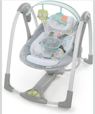 Hamaca mecedora portátil de la marca Ingenuity, modelo Swing 'N Go. - Diseño Hugs and Hoots. - Tecnología Hybridrive para un funcionamiento eficiente. - Plegable para facilitar su transporte y almacenamiento. - Varias velocidades de movimiento. - Con música.