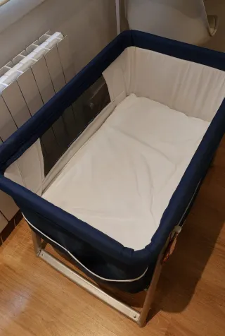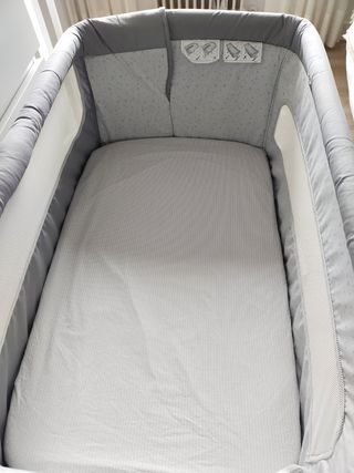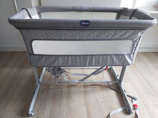 Cuna de colecho Chicco con un diseño moderno y práctico. - Laterales de malla transpirable. - Estructura plegable para fácil transporte. - Incluye cintas de sujeción a la cama. -Sistema en la base retráctil para posición mecedora o posición estable. -Va con sabanas y edredoncito, de regalo. - De primera mano, creo que costó unos 200 euros.