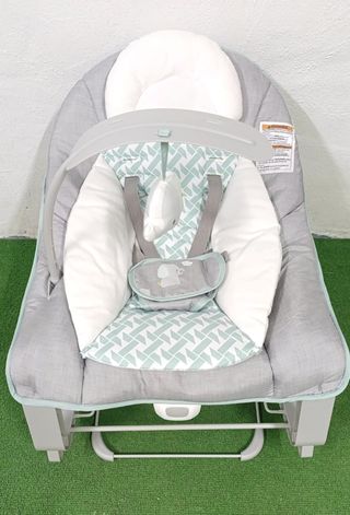 Mecedora para bebé de la marca Ingenuity, con un diseño moderno y divertido. - Incluye dos juguetes colgantes: un león y un elefante. - Tejido suave y cómodo con estampado de elefantes y círculos. - Arnés de seguridad de 3 puntos. Esta nuevo nunca sea usado