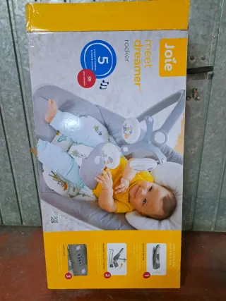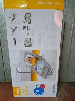 Hamaca para bebé Joie Meet Dreamer, ideal para los primeros meses. - Incluye 5 melodías clásicas y sonidos de la naturaleza. - Función de vibración. - Mecedora con 3 posiciones de reclinado. - Barra de juegos giratoria con 2 peluches. - Plegado compacto para guardarla fácilmente.