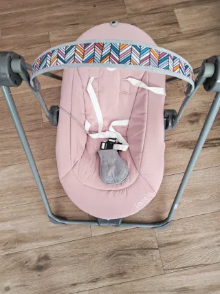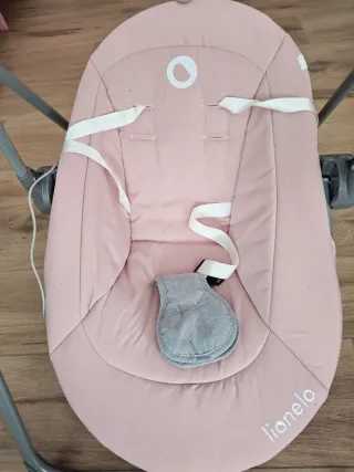 Mecedora para bebé en perfecto estado, casi sin uso. - Color rosa. - Diseño moderno con estampado geométrico en la capota. - Marca Lionelo. - Funciona con pila o con luz.