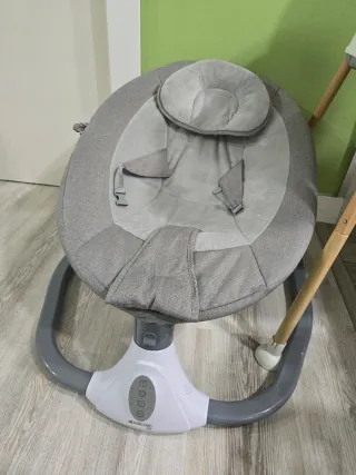 Mecedora para bebé con un diseño moderno y acolchado. - Color gris y verde menta. - Incluye cojín para la cabeza. - Arnés de seguridad. - usada en cuatro ocasiones, a mi bebe no le gusta mucho.