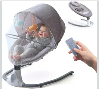 Mecedora eléctrica para bebés, ideal para calmar y entretener a los más pequeños. - Diseño moderno y acolchado. - Capota protectora. - Arnés de seguridad de 5 puntos. - Base giratoria.