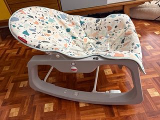 Hamaca mecedora de la marca Fisher Price con un diseño moderno y divertido. - Tapicería con estampado de confeti en tonos pastel. - Estructura gris resistente. - Arnés de seguridad. - Vibración automática En muy buen estado.