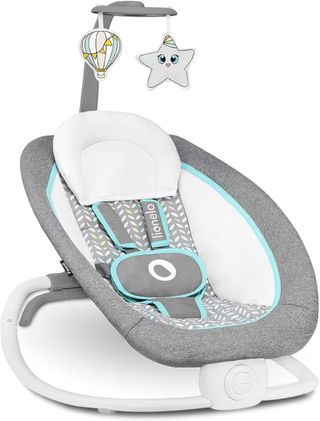 LIONELO Pascal baby bouncer delicadas vibraciones 12 melodías incorporadas con control de volumen ajuste del respaldo barra de juguetes interactivos plegable a tamaño compacto - Estructura gris con detalles en blanco y turquesa. - Arnés de seguridad de 5 puntos.