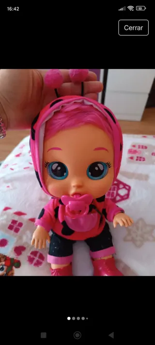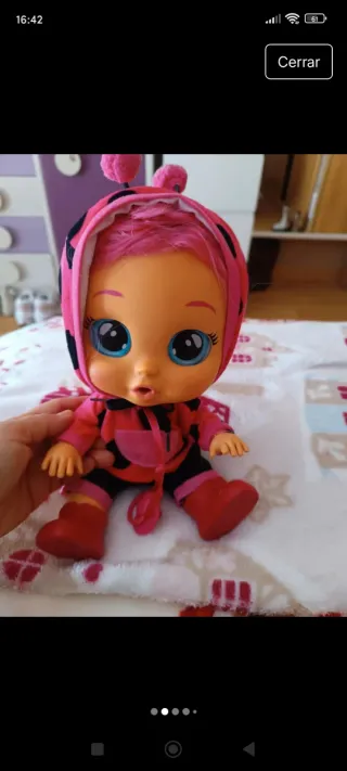Muñeca de la colección Bebés Llorones con un adorable diseño de mariquita. Nueva. - Diseño de mariquita. - Capucha con antenas. - Pelo rosa. - Incluye chupete.