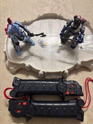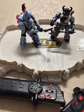 Set de batalla con dos robots luchadores. - Robots con diseño de armadura. - Incluye accesorios de combate como hachas. - Base de arena de combate con logo.