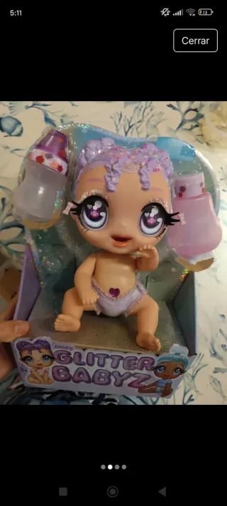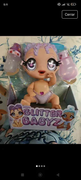 Muñeca Glitter Babyz de MGA, completamente nueva con etiquetas,en su caja. Color morado. - Incluye biberones. - Brilla con purpurina.