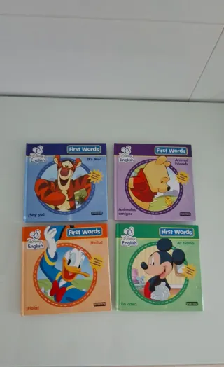 Conjunto de 4 libros bilingües de Disney First Words en inglés y español. - It's Me! con Tigger. - Animal Friends con Winnie the Pooh. - Hello! con Donald. - At Home con Mickey Mouse. No incluye el DVD, solo los 4 libros.