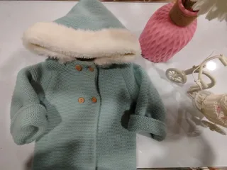 Conjunto de abrigo y gorro para bebé, ideal para mantenerlos abrigados. - Abrigo de punto color verde menta. - Gorro a juego con forro de pelo. - Cierre con botones de madera. Talla 12 meses