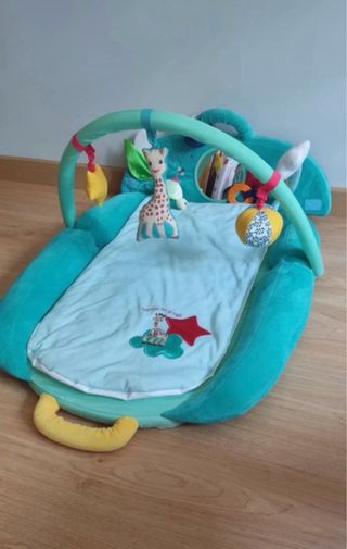 Manta de actividades con diseño de Sophie la Girafe. Ideal para el entretenimiento del bebé. - Incluye varios juguetes colgantes. - Colchoneta acolchada y suave. - Arco de juegos desmontable.