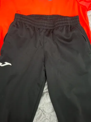 Conjunto deportivo de la marca Joma, ideal para entrenamientos o uso casual. - Camiseta de color naranja brillante. - Pantalón de color negro.