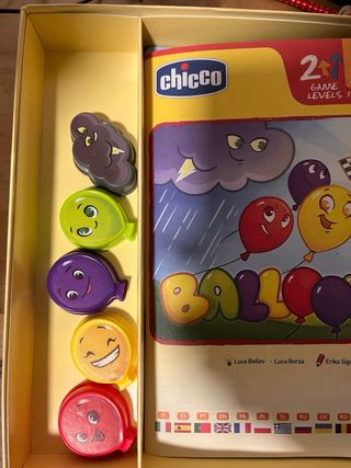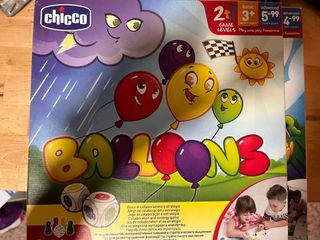 Juego de mesa Chicco Ballons para desarrollar la colaboración y la estrategia. - Niveles de juego: Básico (3+ años) y Avanzado (5-99 años). - Fomenta la comunicación y el pensamiento estratégico. - Incluye dados y fichas.