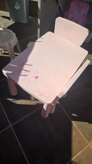 Conjunto de mesa y sillas de plástico, ideal para actividades infantiles. - Color rosa. - Diseño infantil.