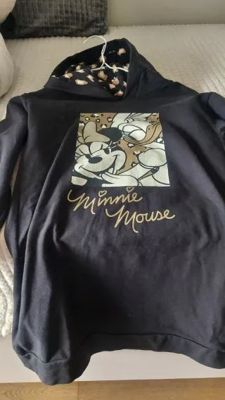 Vestido negro para niña con estampado de Minnie Mouse. - Diseño con capucha. - Estampado frontal de Minnie Mouse. - Interior de la capucha con estampado de leopardo.