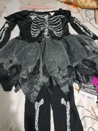 Conjunto de disfraz de esqueleto para niña, ideal para carnaval o Halloween. Incluye 4 piezas. - Diseño de esqueleto plateado. - Falda de tul brillante. - Mangas largas. - Pantalón o mallas a juego.