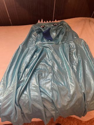 Disfraz de dragón con un acabado brillante y llamativo. Perfecto para fiestas o eventos. - Color azul turquesa. - Capucha con ojos y detalles. - Tejido satinado. talla de 4 a 6 años