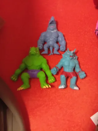 Lote de tres figuras de juguete con temática de dinosaurios. - Figura de dinosaurio verde. - Figura de dinosaurio azul. - Figura de tiburón azul.